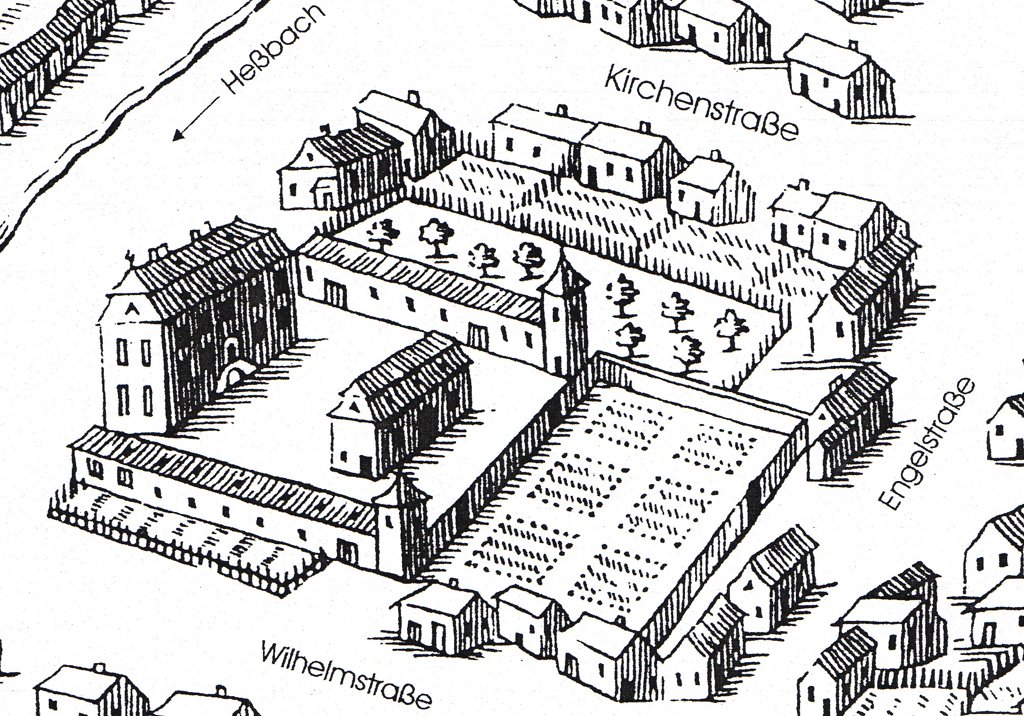 Gemüsegarten mit Weinstöcken liegt entlang der heutigen Wilhelmstraße und der sogenannte Baumgarten zieht sich hinter dem Gefängnisturm parallel zur