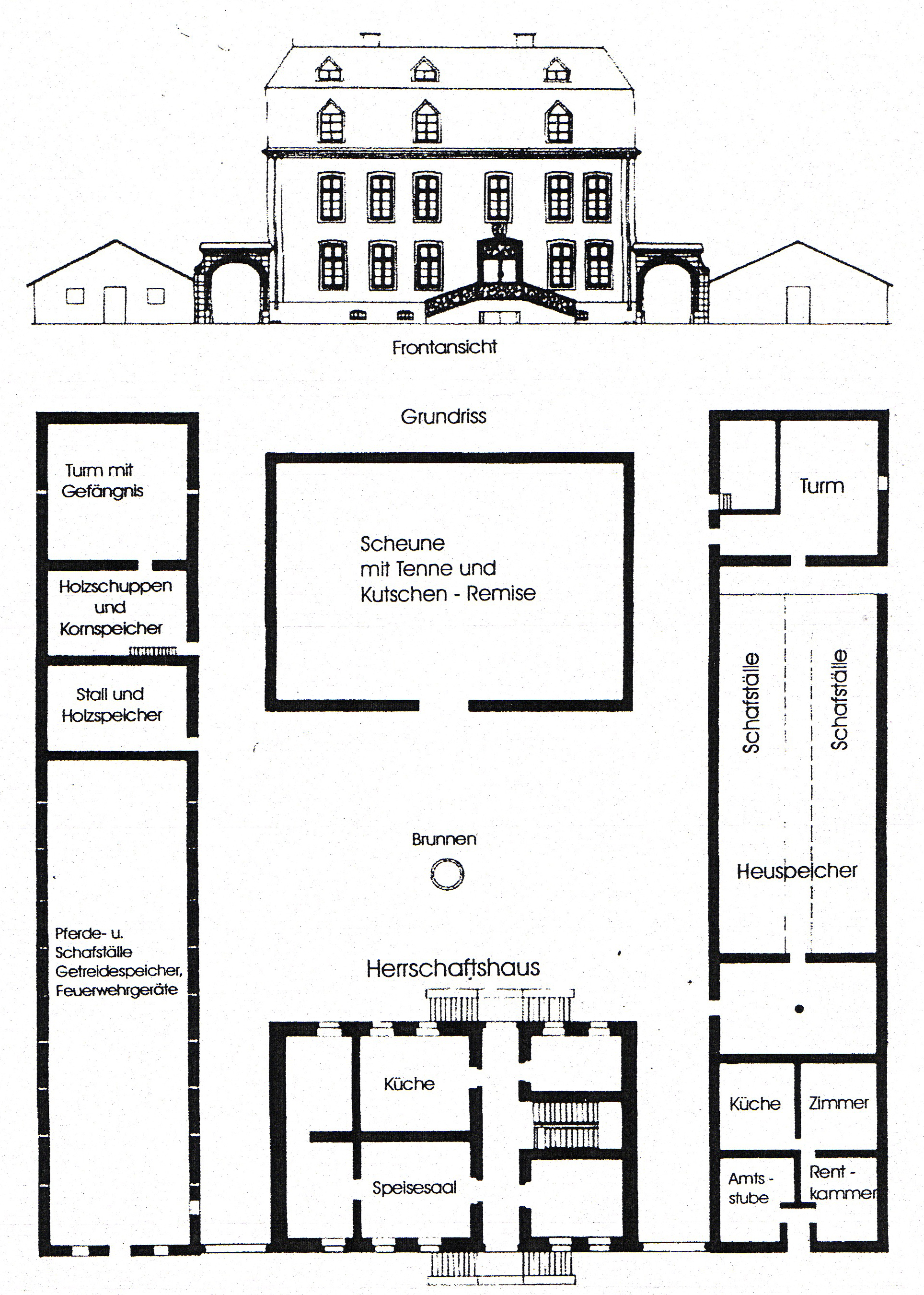 beiden niedrigen Wirtschaftsgebäude rahmen das Schloss, den Hof und die Scheune ein. Richtung Engelstraße enden sie in zwei Türmen. Eine hohe Mauer bildet