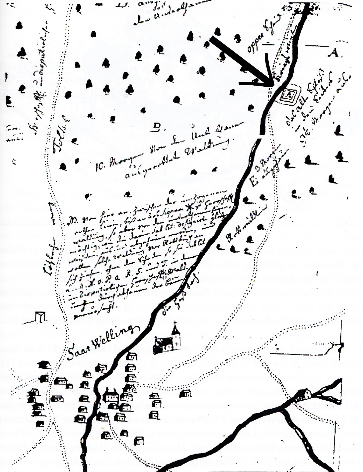 In der Karte aus dem Jahr 1725, gefertigt aus Anlass eines Prozesses der Grafschaft Kriechingen gegen die Gemeinde Saarwellingen